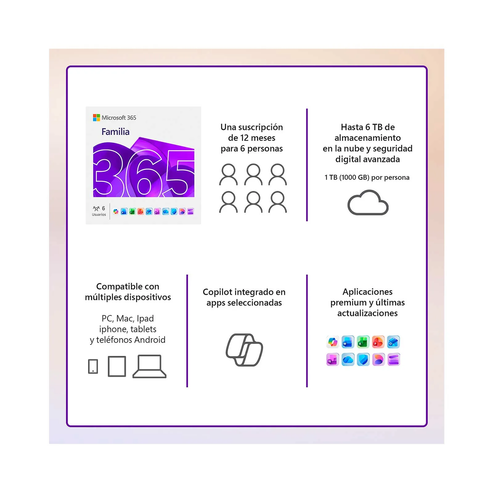 Microsoft 365 Familia es una suscripción integral diseñada para compartir con hasta 6 personas. Ofrece las herramientas de productividad líderes del mercado, una amplia capacidad de almacenamiento en la nube y funciones de seguridad avanzadas para proteger la vida digital de toda la familia en múltiples dispositivos.